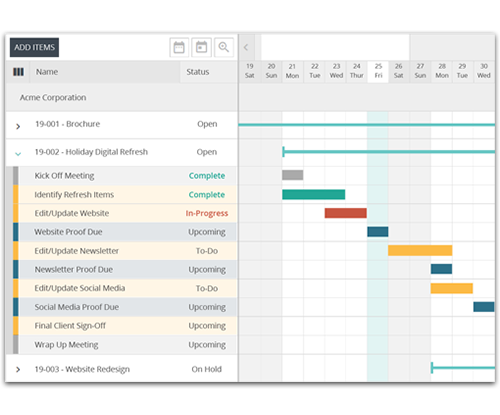 Don’t let deadlines and due dates slip past. Our easy to use interactive gantt charts, production schedules, project email alerts, and progress reports helps you keep everything on track.
