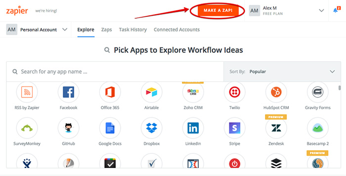 Zapier is a tool that allows users to create connections between common tools such as Gmail, Slack, Trello, Twitter, Evernote, Google Drive, Mailchimp, and more. Zapier can automate tasks to save your team time. For example, it can connect Typeforms to Google Docs so that a spreadsheet row is created when a new client fills out a survey; then, it can connect Typeforms to Trello so that it also creates a Trello card reminding you that you have a new client survey to review.