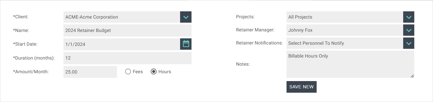 - Enter in the amount per month for the Retainer and select if it is fees or hours based.
