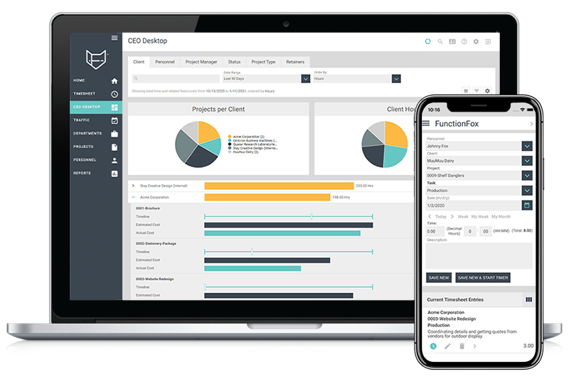 - Keep everyone in the loop, including in-office, freelance and remote team members, with project notifications and alerts. FunctionFox also offers a CEO desktop that enables you to check progress on any project as often as you want